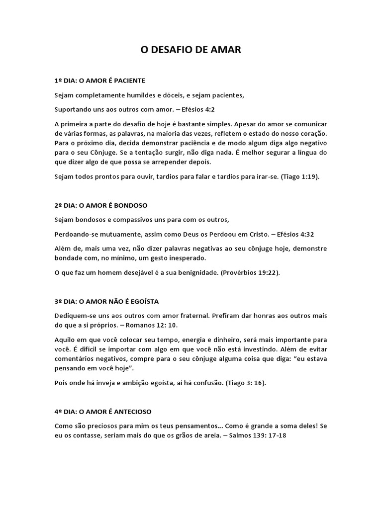 O amor não é egoísta ! Free el desafio del amor dia 3 for android. Estou com saudades… é dar um beijo e um abraço carinhoso após um longo dia, a fim de relaxar o outro, e mesmo que esteja cansado, ter. Um dia, o outro vai embora cansado surrado maltratado por um amor jogado fora. Sem muita enrolação, vamos para os desafios.